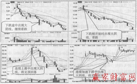 光頭光腳大陰線(以下簡稱大陰線,如上圖所示)實體較長,可略帶上下影線,表明空方取得了決定性勝利。實體越長,空方力量越強。大陰線可以出現(xiàn)在任何情況下:1.下跌剛開始時出現(xiàn)大陰線,相當于在股價受到向下的外力而向下運動時,又受到一個很強的向下的力,股價將加速下跌;2.下跌過程中出現(xiàn)大陰線,相當于在股價向下運動的途中,又受到一個很強的向下的力,股價繼續(xù)看跌;3.連續(xù)加速下跌中出現(xiàn)大陰線時,則空方能量可能已經(jīng)耗盡,股價將見底回升;4.連續(xù)上漲中出現(xiàn)大陰線,則是在多方能t已經(jīng)耗盡的情況下提供一個向下的力,股價將見頂回落。