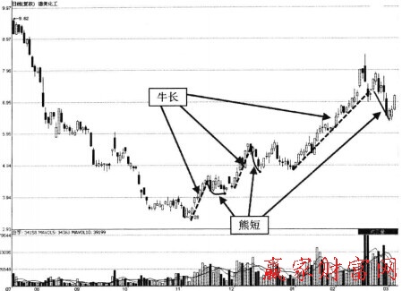 牛長熊短形態(tài)多出現(xiàn)在主力的建倉階段,是主力資金持續(xù)吸籌的一種表現(xiàn)形式。當(dāng)然,在分析牛長熊短形態(tài)是否確切地反映了主力建倉這一市場含義時,我們還應(yīng)結(jié)合價格的總體走勢分析,只有出現(xiàn)在低位區(qū)的牛長熊短形態(tài)且伴以量能的放大,才是較為可靠的主力資金建倉信號;而對于那些出現(xiàn)在明顯高位區(qū)的牛長熊短形態(tài),我們只可將其理解為主力資金暫時并沒有明顯的出貨行為。