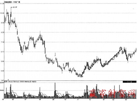 圖2為中電廣通(600764)2008年5月12日至2009年3月20日期間走勢圖,如圖標(biāo)注所示,此股在持續(xù)下跌后的低位區(qū)出現(xiàn)了牛長熊短的走勢,與這一走勢一同出現(xiàn)的就是成交量的溫和放大,這正是場外買盤資金源源不斷流入的跡象,預(yù)示著趨勢的反轉(zhuǎn),是我們進行中長線布局的時機。