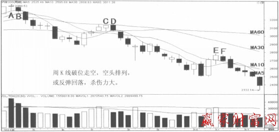 周均線空頭排列,中線走空,持續(xù)時(shí)間長,跌幅大。