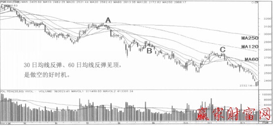圖2解析:A處:反彈至半年線和年線附近,受半年線壓制和季線向下引帶,形成小雙頭見頂形態(tài),至A處向下破位,均線向下發(fā)散,股指加速下跌,下跌時(shí)間長,下跌幅度大。