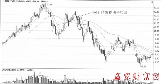 K線向下穿破移動(dòng)平均線指的是K線從移動(dòng)平均線的上方向下運(yùn)行,穿破移動(dòng)平均線,如圖1所示。