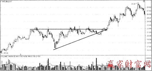 3.上升三角形的應(yīng)用分析。通常來(lái)講,上升三角形在形成過(guò)程中成交量會(huì)不斷減少。上升三角形是多空雙方實(shí)力較量的結(jié)果,上升三角形到最后都會(huì)選擇向上突破。但是必須指出的是,上升三角形向上突破時(shí),一般都配有較大的成交量,無(wú)量往上突破可能是假突破,投資者不可貿(mào)然加入。另外,要注意的是,上升三角形越早往上突破,則后勁越足,那些遲遲不能突破的上升三角形,很可能是主力悄悄出貨而故意為中小散戶(hù)設(shè)置的多頭陷阱。如果一旦主力達(dá)到目的,在他們出貨完畢后,上升三角形非但不會(huì)往上突破,而極有可能演化成“雙頂”形態(tài),股價(jià)下躍就不可避免,投資者對(duì)此務(wù)必要提高警惕。一般情況下,上升三角形突破位置一般應(yīng)在三角形橫向?qū)挾鹊?/2~3/4處,超過(guò)橫向距離的3/4處的突破,該上升三角形的形態(tài)參考價(jià)值就會(huì)降低。