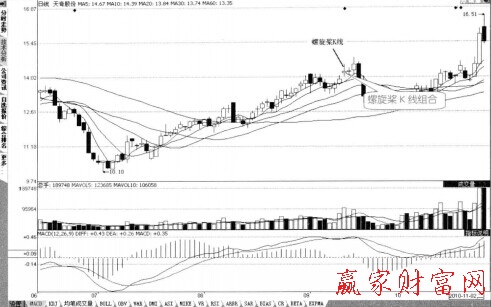 2.如果在漲勢(shì)中出現(xiàn),表明后市看跌。例如個(gè)股天奇股份(002009)在上漲的過(guò)程中出現(xiàn)螺旋K線,后市出現(xiàn)下跌行情。