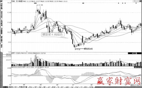 如果在螺旋槳之后以橫盤形式出現(xiàn)幾個(gè)小陰線,小陽(yáng)線,可結(jié)合5日均線變化價(jià)況觀察2~3天并作決定。