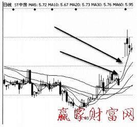 如圖中所示為ST中房日K線圖。圖中箭頭所指的兩個區(qū)域為兩個向上的跳空。原本在調(diào)控前,市場處于上漲后的盤整期,多空雙方激烈交戰(zhàn),向上跳空形成后,價格從盤整轉(zhuǎn)向繼續(xù)上漲。