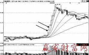 再如圖所示為白云山A日K線圖。圖中箭頭所指的兩個空白處為兩個向上的跳空。在跳空之前,價格處于一個盤整的過程中,而且盤整的持續(xù)時間很長,這時連續(xù)出現(xiàn)兩個跳空,說明買方取得了戰(zhàn)斗的勝利,后市依然看漲。