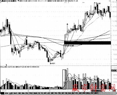 在收出一根十字線之后,莊家就開(kāi)始向上拉升股價(jià),此時(shí)成交量出現(xiàn)了明顯的放大,并且連續(xù)收出放里上漲的陽(yáng)線,這就標(biāo)志著莊家正式啟動(dòng)行清。從圖上可以看到,股價(jià)隨底部放里后就走出了一波上漲行情。