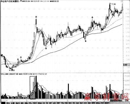 如圖所示的華業(yè)地產(chǎn),該股也是在股價(jià)處于底部區(qū)城時(shí)出現(xiàn)了放量拉升的走勢(shì),出現(xiàn)這種走勢(shì)之后,股價(jià)同樣也走出了一波上漲行情。