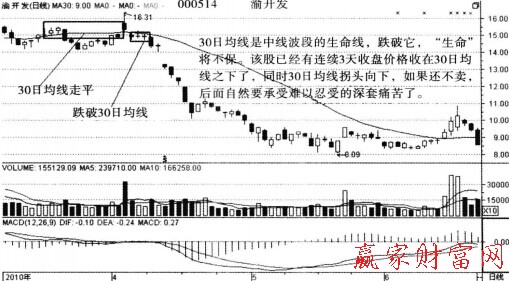 3.投資者需要注意的是,股價向上突破30日均線時必須要有成交量放大的配合。有時股價向上突破30日均線后又回抽確認(rèn),但不應(yīng)再收盤在30日線之下,且成交量必須較突破時顯著萎縮,此時是最佳買入時機。無論是在突破當(dāng)日買入還是網(wǎng)抽時買入,萬一不漲反跌,而股價重新跌破30日均線,走勢疲軟,特別是股價創(chuàng)新低繼續(xù)下跌時,投資者應(yīng)止損出局。因為前期的上漲很可能是下跌中途的一次中級反彈。真正的跌勢尚未結(jié)束。