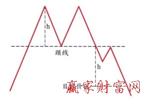 3.雙重頂形態(tài)可以通過測(cè)算雙重頂?shù)母叨却_定目標(biāo)價(jià)位。由于雙重頂?shù)膬蓚€(gè)頂基本處于同一水平,測(cè)算出頂點(diǎn)到頸線的垂直距離h;同時(shí),以突破點(diǎn)為起點(diǎn),向下投射等同h的距離,就是雙重頂?shù)哪繕?biāo)價(jià)位,如圖1所示。