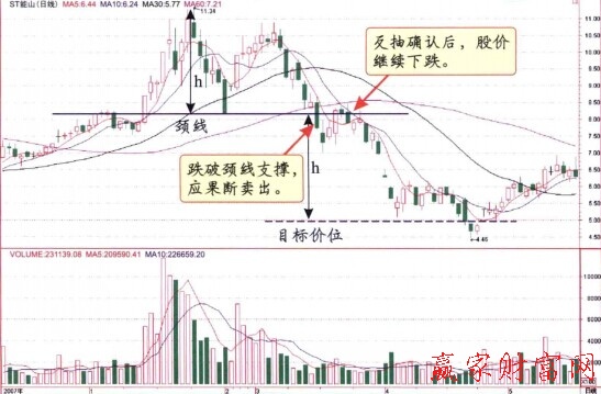 2.股價(jià)跌破頸線時(shí)應(yīng)果斷清倉(cāng)離場(chǎng)。