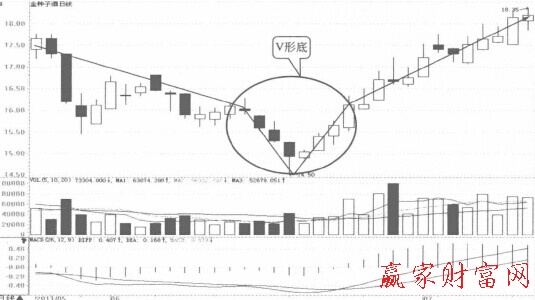 V形底也稱作尖底,指的是股價(jià)先跌后漲的K線形態(tài),形似類似大寫字母V,如圖所示。