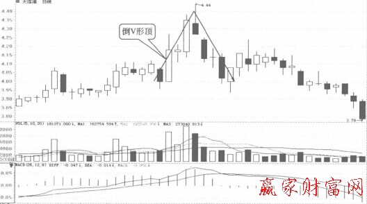 如圖所示,2011年4月中旬至月底,大連港(601880)的日K線圖上出現(xiàn)了倒V形頂形態(tài)。在倒V形頂形態(tài)中,股價(jià)被迅速拉高后又被迅速打壓,知坐過山車般回到起點(diǎn)。這表明主力誘多出貨,投資者被套,后市將進(jìn)入下跌行情,投資者應(yīng)及時(shí)賣出股票。