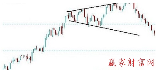 當股價從第三個高點回跌,其回落的低點較前一個低點為低時,可以假設形態(tài)的成立。和頭肩頂一樣喇叭形屬