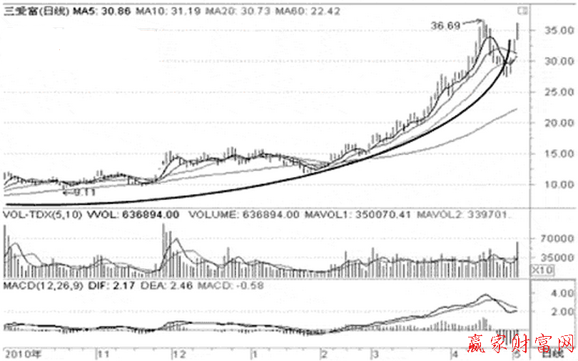 如圖所示為三愛富的門K線圖,該股絕對(duì)是一只超級(jí)黑馬。股價(jià)在底部盤旋了很長一段時(shí)間,但是從長期來看,股價(jià)在緩慢上升的過程中到了15元左右的時(shí)候,又經(jīng)歷了2個(gè)月的長時(shí)間盤整,這段時(shí)間成交量逐步萎縮,股價(jià)有小幅下跌的趨勢(shì),從2011年2月開始,成交量慢慢放大,股價(jià)很快被拉升,到4月中旬,股價(jià)達(dá)到最高價(jià)36.69元,股價(jià)幾乎翻了兩倍。若是在股價(jià)底部緩慢上升時(shí)己買入該股,后期利潤極為可觀。