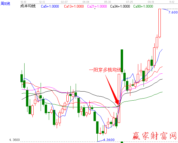 在追尋歷史會(huì)重新演繹的過程中,我們發(fā)現(xiàn)當(dāng)周K線陽線的實(shí)體呈現(xiàn)一舉貫穿5周、10周、20周、30周甚至60周均線時(shí)候(至少三條周均線以上,貫穿的均線越多越好),即出現(xiàn)完美的出水芙蓉形態(tài)往往是連續(xù)大幅飆升的開始階段。如果此時(shí)股價(jià)處于低位而量能可以持續(xù)放大,就會(huì)形成連續(xù)上漲甚至連續(xù)漲停。下面我具體介紹一下出水芙蓉的特征。