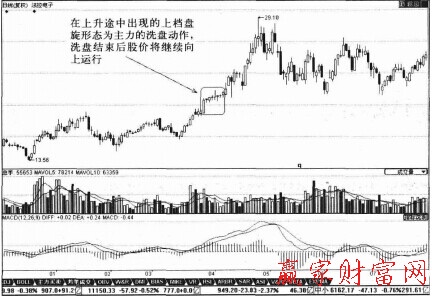 再如下圖個股中的上檔盤旋形態(tài)出現(xiàn)在上升途中,此時股價并沒有過大的漲幅,并且盤整的時間也較短。一般情況下這種盤整多為主力在此進(jìn)行震倉洗盤,當(dāng)洗盤結(jié)束后股價將繼續(xù)走上升趨勢。因此投資者在上升途中見到此形態(tài)出現(xiàn)時可等股價突破盤整高點時跟進(jìn),短線上可獲得不錯收益。