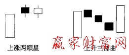 上漲兩穎星由三根K線組成,第一根為大陽線或中陽線,接著有兩根為實(shí)體較小的K線或十字星組成。后面兩根K線可陽可陰,且其中心需高于第一根陽線的收盤價(jià)或在其收盤價(jià)附近。上漲兩穎星中的“兩穎星”也可以是三顆星,其含義不變。上升三部曲一般由五根K線組成,第一根為大陽線或中陽線,接著出現(xiàn)三根小陰線,三根小陰線最后一根的收盤價(jià)不應(yīng)低于第一根陽線的開盤價(jià),最后拉出一根大陽線或中陽線。最后那根陽線的收盤價(jià)應(yīng)高于第一根陽線的收盤價(jià)。上漲兩顆星和上升三部曲出現(xiàn)在上漲途中,持股的投資者可以繼續(xù)看漲,其標(biāo)準(zhǔn)圖形如下所示。