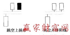 跳空上揚(yáng)形K線由兩根陽線一根陰線組成,先拉出一根跳空向上的陽線,留下一個(gè)缺口,第二天又出現(xiàn)一根高開低走的陰線,但該陰線的收盤價(jià)收在跳空缺口上方附近,使缺口暫時(shí)留下。跳空缺口一旦回補(bǔ),就不能視其為跳空上揚(yáng)形K線組合。高位并排陽線的K線組合圖形和跳空上揚(yáng)形K線組合有些相似,只是第三根K線為低開高走的陽線,同時(shí)第二根K線和第三根K線的最低價(jià)位基本位于同一水平位置。跳空上揚(yáng)形和高位并排陽線的標(biāo)準(zhǔn)K線組合如圖所示。