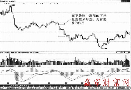 下檔盤旋技術(shù)形態(tài)特征:股價經(jīng)過一輪下跌后進(jìn)入了小陰小陽地橫向整理,隨后出現(xiàn)一根跳空下跌的陰線,將前一段整理格局打破。