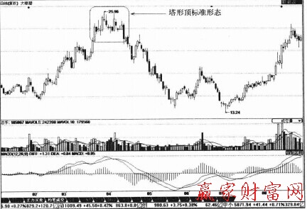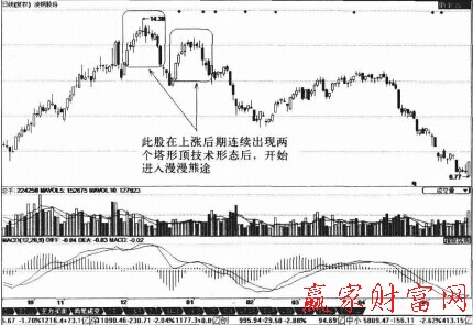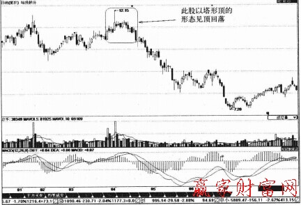 從圖3中可以看到,此股在高位區(qū)城出現(xiàn)了兩個塔形頂,(也可以看做是雙頂)之后股價步入一輪熊市,可見塔形頂?shù)囊婍斝盘柺欠浅?qiáng)烈的,只有盡早離場才是正確的選擇。