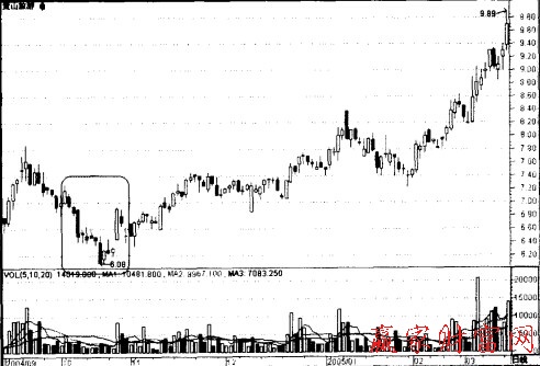 2.股價在前期曾出現(xiàn)過大跌的行情,但目前的跌勢逐漸緩慢下來;