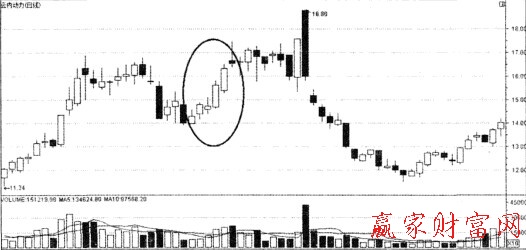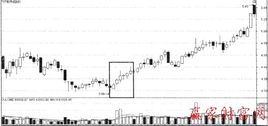 所謂低檔五根陽(yáng)線是指在下跌持續(xù)一段時(shí)期后,K線圖連續(xù)出現(xiàn)了五根陽(yáng)線(有時(shí)可能是六根或七根),表示在此價(jià)位多方承接力量較強(qiáng)。低檔五根陽(yáng)線的圖形如圖所示。
