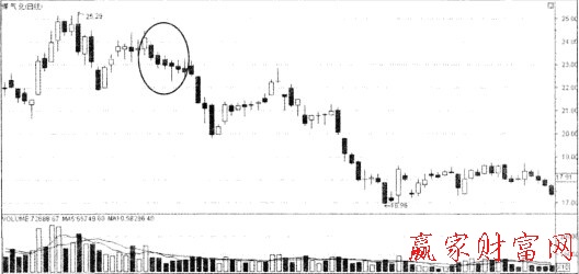 一般而言,在高位盤(pán)整中突然出現(xiàn)連續(xù)五陰線,此為行情看壞的明證。在上端連出五陰線,表示空頭固守陣線不退讓,隨后多頭可能將拋售了結(jié)。