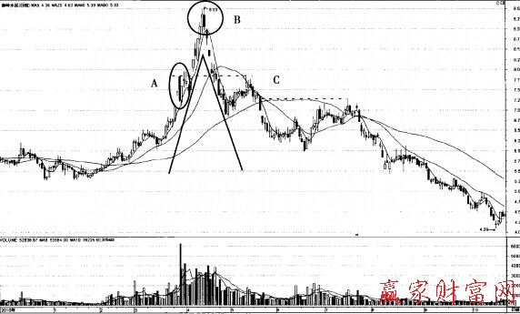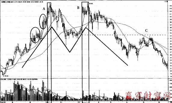 如圖所示,該股股價(jià)經(jīng)過長期大幅上漲,在股價(jià)的高位出現(xiàn)一個(gè)傳統(tǒng)理論中的M頭,之后股價(jià)開始迅速下跌并跌破前期低點(diǎn),C點(diǎn)股價(jià)回抽前期低點(diǎn)確認(rèn)了這個(gè)逃逸形態(tài)的成立,該股進(jìn)人照市運(yùn)行周期。