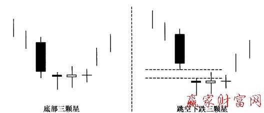 2.需要注意的是,如果在深跌后的低價(jià)位區(qū)域出現(xiàn)與之類似的形態(tài),則是底部三顆星,是股價(jià)見(jiàn)底信號(hào),如果其中的第一根陰線與第二根星線之間有大幅度的跳空,形成了一定的缺口,則為跳空下跌三顆星,見(jiàn)底信號(hào)更為強(qiáng)烈。這時(shí),投資者不能將其按照下跌三顆星操作,而應(yīng)該冷靜觀察,等待其他信號(hào)的出現(xiàn),如圖所示。