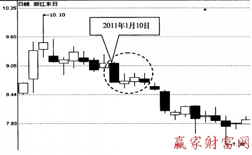 如圖所示,浙江東日(600113)自2010年12月29日開(kāi)啟了一輪下跌行情,在下跌初期的2011年1月10~13日四個(gè)連續(xù)的交易日形成了下跌三顆星形態(tài)。