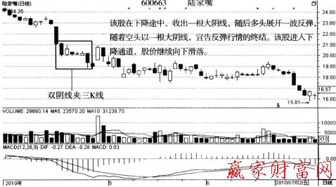 雙陰線夾三K線形態(tài)屬于持續(xù)形態(tài)。在下降趨勢(shì)中的雙陰線夾三K線形態(tài)中,如果頭、尾兩根陰線對(duì)應(yīng)的交易量超過(guò)了中間那群小K線的交易量,那么,該形態(tài)的分量就更重了。
