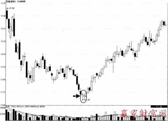 如圖為大冶特鋼(000708)2010年4月29日至2010年9月6日期間走勢圖。此股在短時(shí)間快速下跌之后于階段性的低點(diǎn)出現(xiàn)了低檔雙陽長影線的形態(tài),這是多方有意發(fā)動(dòng)反擊、空方己無力再度打壓的標(biāo)志,此時(shí)可以進(jìn)行短線買股操作。