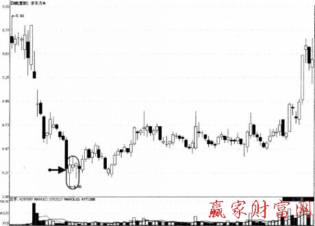 如圖為京東方A(000725)2010年6月1日至2010年10月27日期間走勢圖。此股在經(jīng)短期一波深幅下跌后,于階段性的低點(diǎn)連續(xù)三日出現(xiàn)了影線較長的陽線形態(tài)。這既是止跌企穩(wěn)跡象的顯現(xiàn),也是多方有意反攻的信號,此時(shí)可以進(jìn)行積極的短線買股操作。
