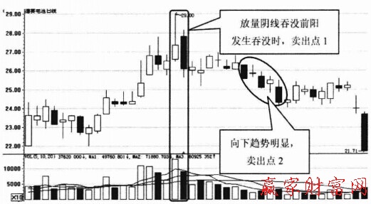 一般情況下,形成前一根陽線時的成交量要大于形成后一根陰線時的成交量。放量陰線吞沒前陽的出現(xiàn),說明市場主導(dǎo)權(quán)已經(jīng)易手,未來將在空方力量的作用下出現(xiàn)一波下跌行情,如圖所示。