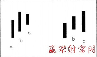 如圖所示,b和c是具有母子關(guān)系的母子K線,b和a非母子關(guān)系。當(dāng)b的高點(diǎn)大于a的高點(diǎn)時(shí),b和c取向上合并。