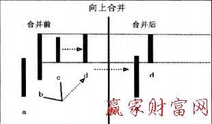 如圖所示,a、b、c為向上合并,b、c母子K線取母高子低,經(jīng)合并后變成新K線d,原a、b、c三根K線合并后變?yōu)閍、d。
