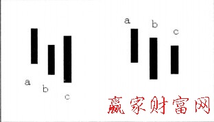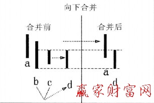 如圖所示,a、b、c為向下合并,b、c母子K線取母低子高,經(jīng)合并后變成新K線d,原a,b、c三根K線合并后變?yōu)閍、d。