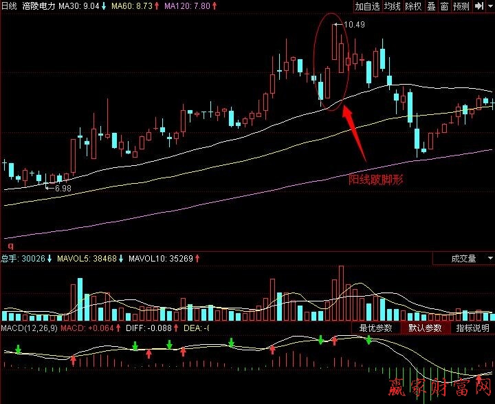 如圖顯示的是2009年6月3日到2009年9月24日的涪陵電力(600452)的日K線圖。涪陵電力的股價(jià)經(jīng)過不斷拉升后,出現(xiàn)了陽線跋腳形K線組合,暗示著上檔拋壓沉重,是一個(gè)賣出信號(hào),投資者見此K線圖,應(yīng)及時(shí)賣出手中的股票,離場(chǎng)觀望。