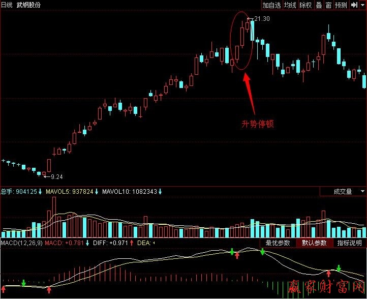 如圖顯示的是2007年7月13日到2007年10月10日的武鋼股份(600005)的日K線圖。武鋼股份的股價(jià)經(jīng)過多次拉升后,拉高到21.30元,接著出現(xiàn)了升勢(shì)停頓,幾線組合,表明做多的后續(xù)力最己經(jīng)跟不上,股價(jià)隨時(shí)會(huì)出現(xiàn)回落。投資者見到該K線組合,要保持等惕,及時(shí)清倉離場(chǎng)。