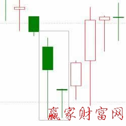 形態(tài)介紹:上漲形態(tài)。在下跌趨勢(shì)中,出現(xiàn)一根帶長下影線的陰線,緊接著出現(xiàn)一根小K線,第二根K線的實(shí)體及陰線,完全處于前跟K線的長下影線之內(nèi),此時(shí)意味著下跌行情可能發(fā)生反轉(zhuǎn),被稱為下跌盡頭線。