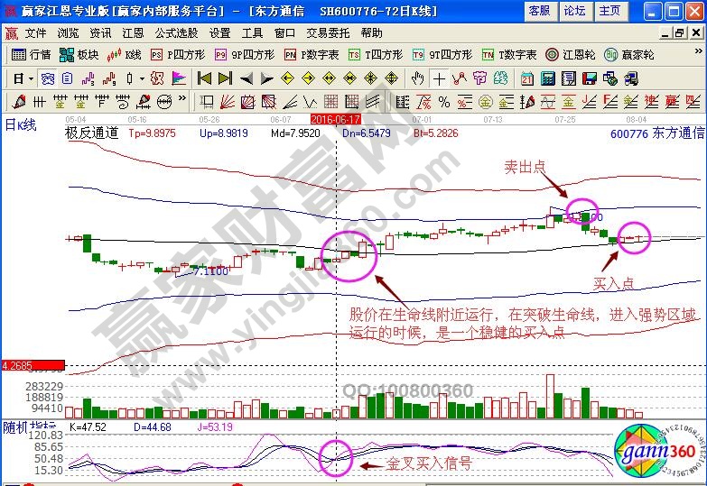 依據(jù)股價的走勢形態(tài),比如是K線組合形態(tài),就是其中的一種,如下圖在極反通道中的個股走勢形態(tài),依據(jù)贏家江恩軟件的使用規(guī)則,可以判斷的是一只具有上漲潛力的個股,投資者可以加入自選股進(jìn)行關(guān)注。