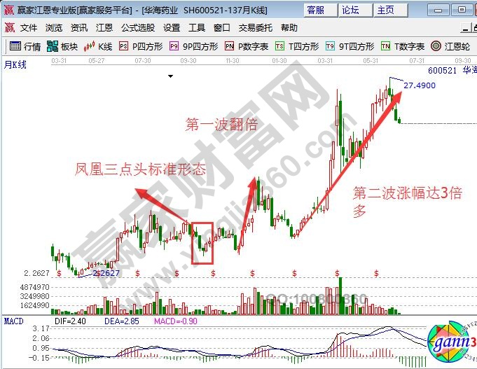 復(fù)盤中遇到鳳凰三點(diǎn)頭時(shí)往往在第四天陽收確立時(shí)尾盤參與,或者第五天逢低介入,可獲得良好的收益。如下圖600521華海藥業(yè)月線圖,2012年1月該股連續(xù)三根陰線下跌,第四根月K線平開一路震蕩走高,第5根月K線帶有上下影線的小陽線,符合鳳凰三點(diǎn)的要求,該股隨后上攻收益后15%后,再度調(diào)整但未破2012年1月的低點(diǎn),確認(rèn)箱體底部后走出翻倍行情。最瘋狂的一波漲幅達(dá)3倍多。