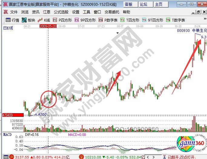 再如日線如下圖000930中糧生化,2009年5月19號至5月25號的走勢形態(tài)。符合鳳凰三點(diǎn)標(biāo)準(zhǔn)形態(tài)。該股第五天大陽報(bào)收,隨后調(diào)整依然未跌破5月21號低點(diǎn),休整結(jié)束后走出漲幅50%的行情。