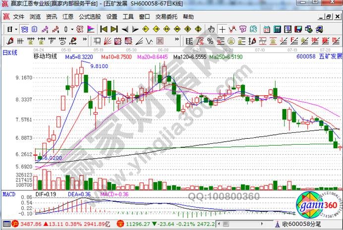 五礦發(fā)展在2006年6月13日前后的走勢圖中,我們可以看到股價(jià)從6月初連續(xù)走高之后,在6月13日摸高至9元,上方之后便形成“城下霜月”譜圖形,股價(jià)一路下行至8月7日的6.31元方才止住。跌幅達(dá)40%左右。