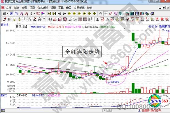 上圖是浪潮軟件在2011年10月份至11月份的走勢(shì)圖,從上圖我們可以看到該股在10月24當(dāng)太難觸及最低價(jià)9.8元之后,股價(jià)緩慢上漲,日K線上連續(xù)拉出7根紅色洋相。在11月1日收盤價(jià)為11.67元,較最低價(jià)9.8元上漲了19.08%。該股在11月2日,又出現(xiàn)了漲停板,而且該股更是連續(xù)三天累計(jì)漲幅達(dá)到了30%。顯然運(yùn)用全紅連陽(yáng)走勢(shì),投資者是可以捕捉到暴漲的股票的。