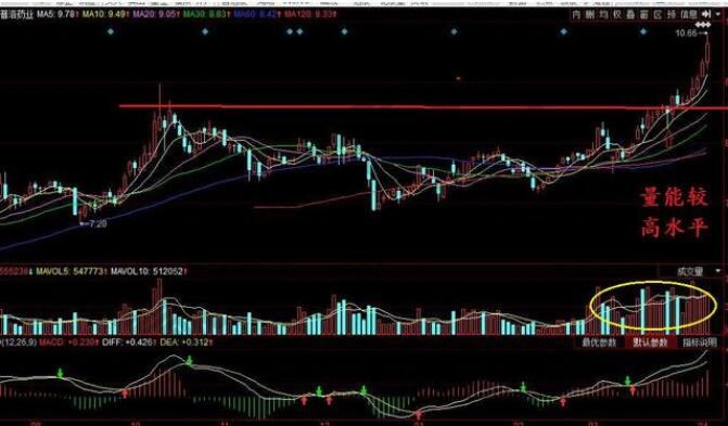 以漲停為前導(dǎo),股票價(jià)格在長(zhǎng)陽(yáng)實(shí)體上方作橫向整理,在回靠十日均線的時(shí)候稍作停留之后以陰線下穿,五日均線十日均線死叉,20日均線30日均線趕上,企穩(wěn)就會(huì)以陽(yáng)線形式向上大漲,量度漲幅超過10%。最好的買入時(shí)機(jī)是五日均量線和40日均量線粘合的時(shí)候。