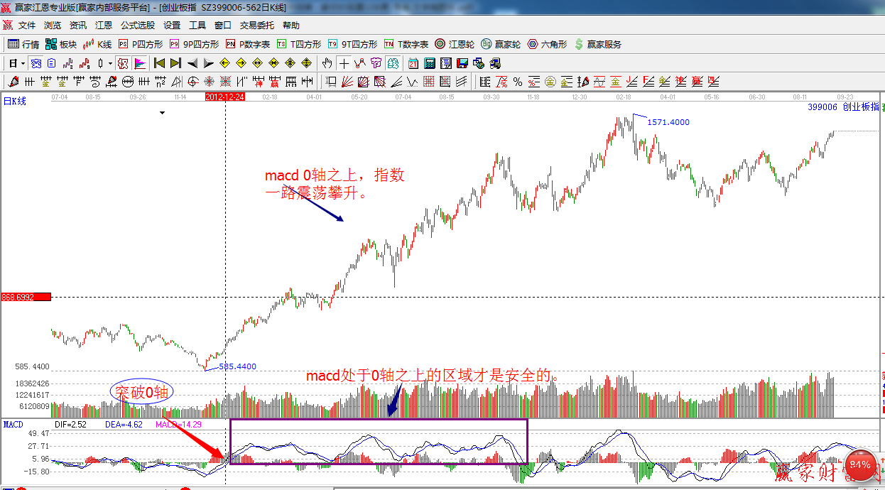 請大家認真看一下創(chuàng)業(yè)板走勢的日線圖2012年12月24日開始,macd的黃白線站上了0軸,隨后一路震蕩攀升,一直到1400--1500多,相信2013年里,人人都看到了創(chuàng)業(yè)板的牛市拉升,所以參與0軸之上的個股或指數(shù),回避0軸下方的市場或股票,這就是最簡單的防狼術,