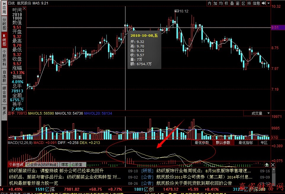 如 600987航民股份,該股在2010年10月8日股價見高9.7元后,2010年月11日股價再創(chuàng)新高10.12元,股價雖創(chuàng)新高,但2010年10月15日D與DEA的死叉點為0.25,而2010年11月12日DIFF與DEA的死叉點為0.16~明顯的前一個死叉點高于后一個死叉點,這就是頂背離,說明這種創(chuàng)新高的可信度不高,后面可能展開調(diào)整,如圖。